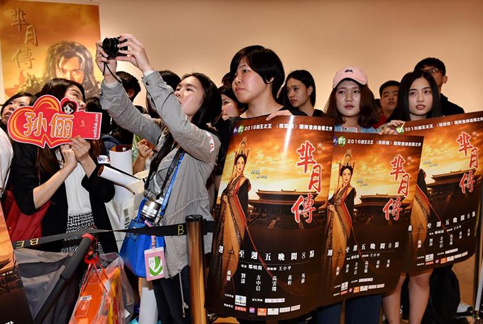 2016年4月7日,台湾粉丝在《芈月传》宣传现场助威。(图/新华社)