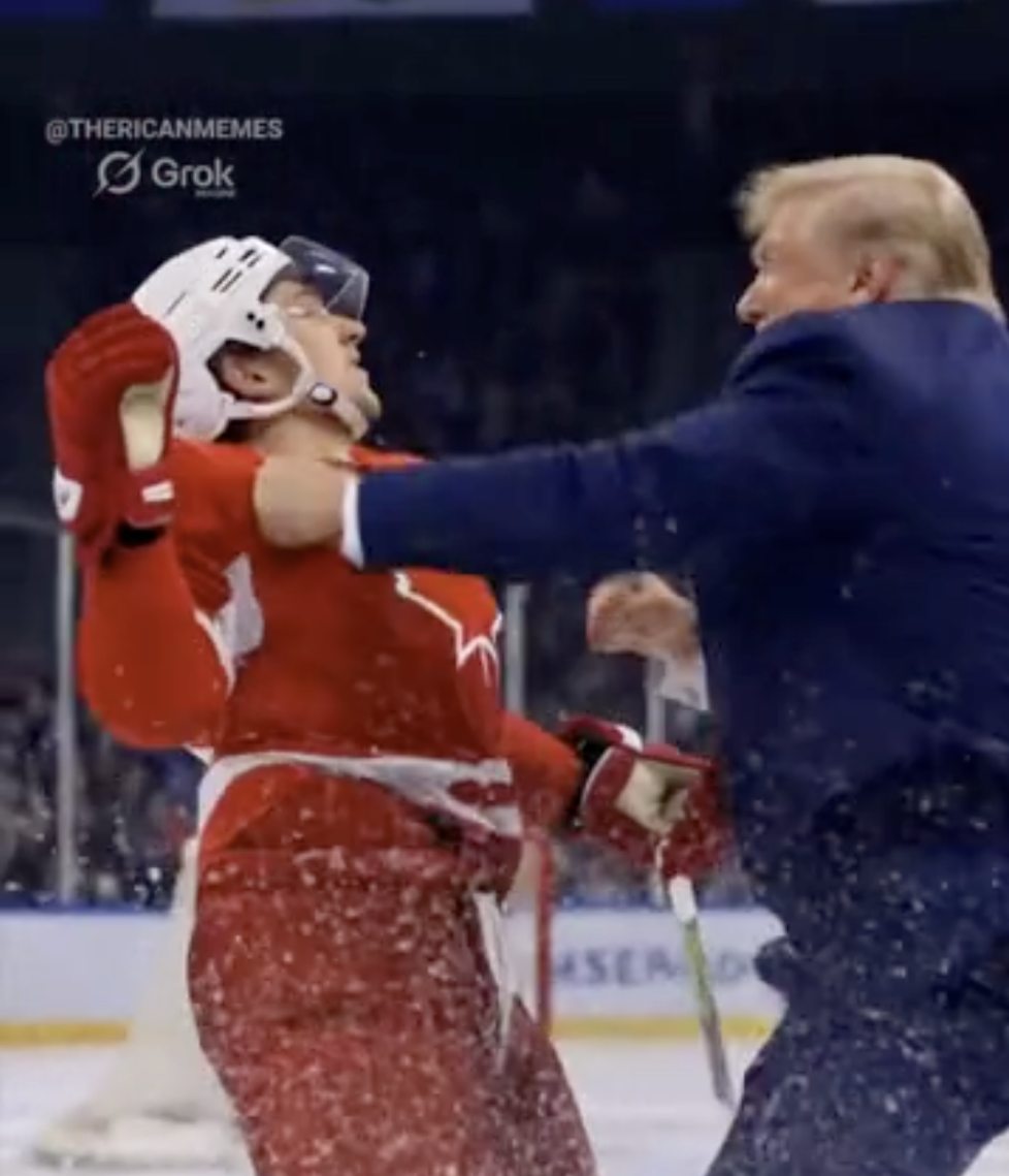 视频显示,比赛进行到一半时,特朗普脱下手套,并赤手空拳殴打加拿大运动员。比赛最后,特朗普再次进球,有外媒形容此举为“一举拿下加拿大”。