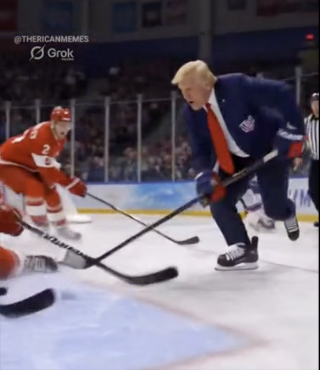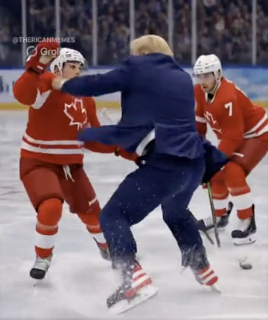 【环球网报道记者闫珮云】据“今日俄罗斯”(RT)电视台报道,美国总统特朗普当地时间23日在社交媒体上发布一段由人工智能(AI)生成的视频,视频中,美国队与加拿大队在冰球场上激烈角逐,特朗普则化身美国冰球运动员,手持球杆屡屡进球,甚至当场殴打对方。