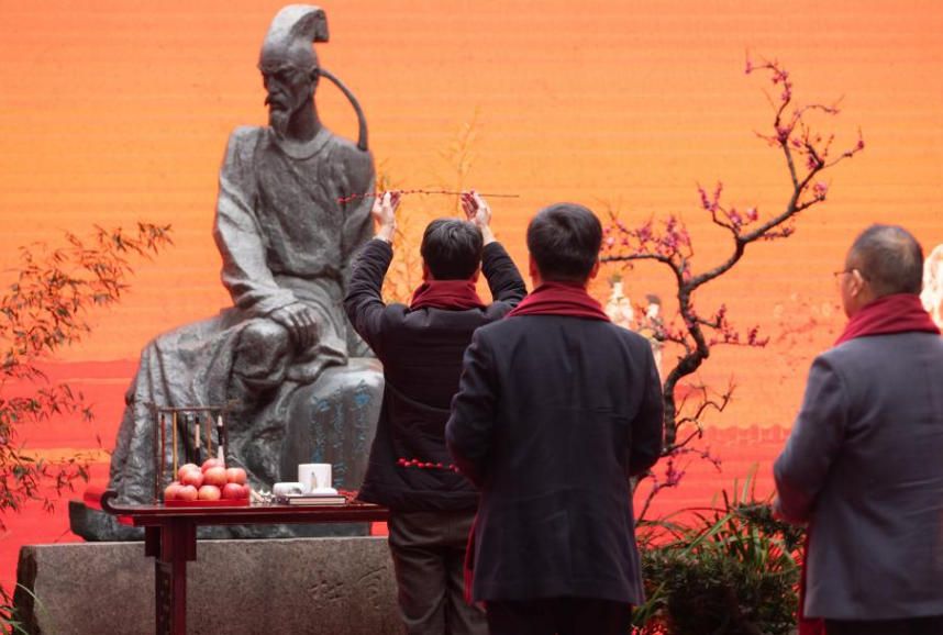 图为民众向诗圣杜甫塑像敬献梅枝。(中新社)