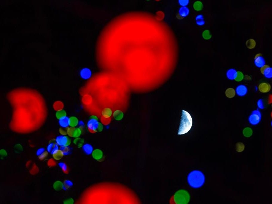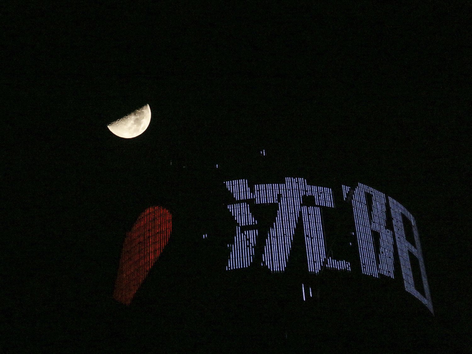2月24日,年度最大上弦月现身天宇。当太阳、地球与月球连线呈直角,且月球在太阳东边时,月球西边半球被照亮,从地球上看过去,犹如一个大写的英文字母 “D”,明晃晃地悬于夜空之上,称为上弦月。图为2月24日,2026年最亮最大上弦月悄然爬上夜空。(香港中通社)