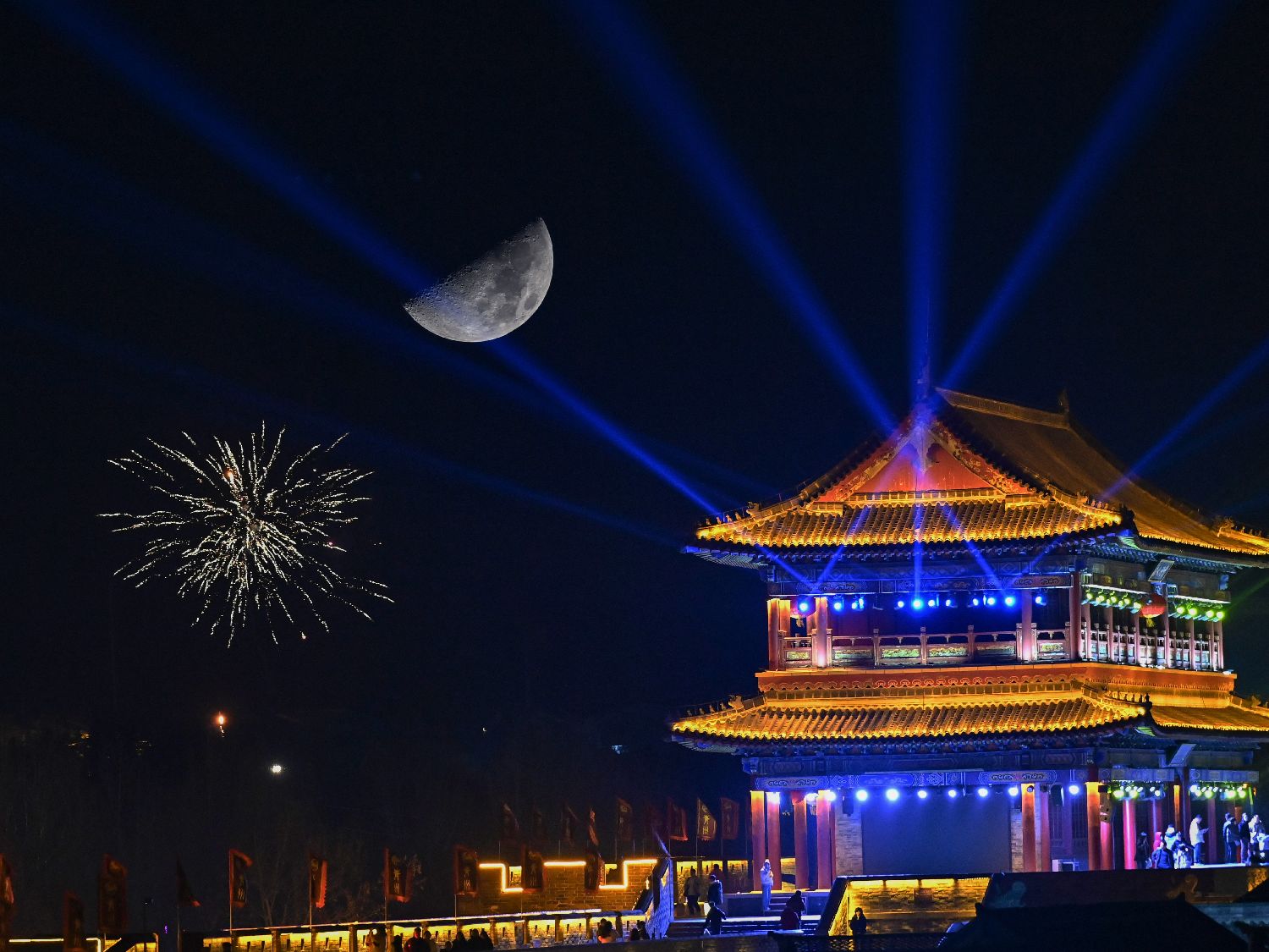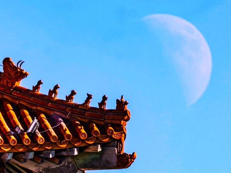 图为2月24日,山东青州古城景区拍摄的月亮(二次曝光)。(CFP)