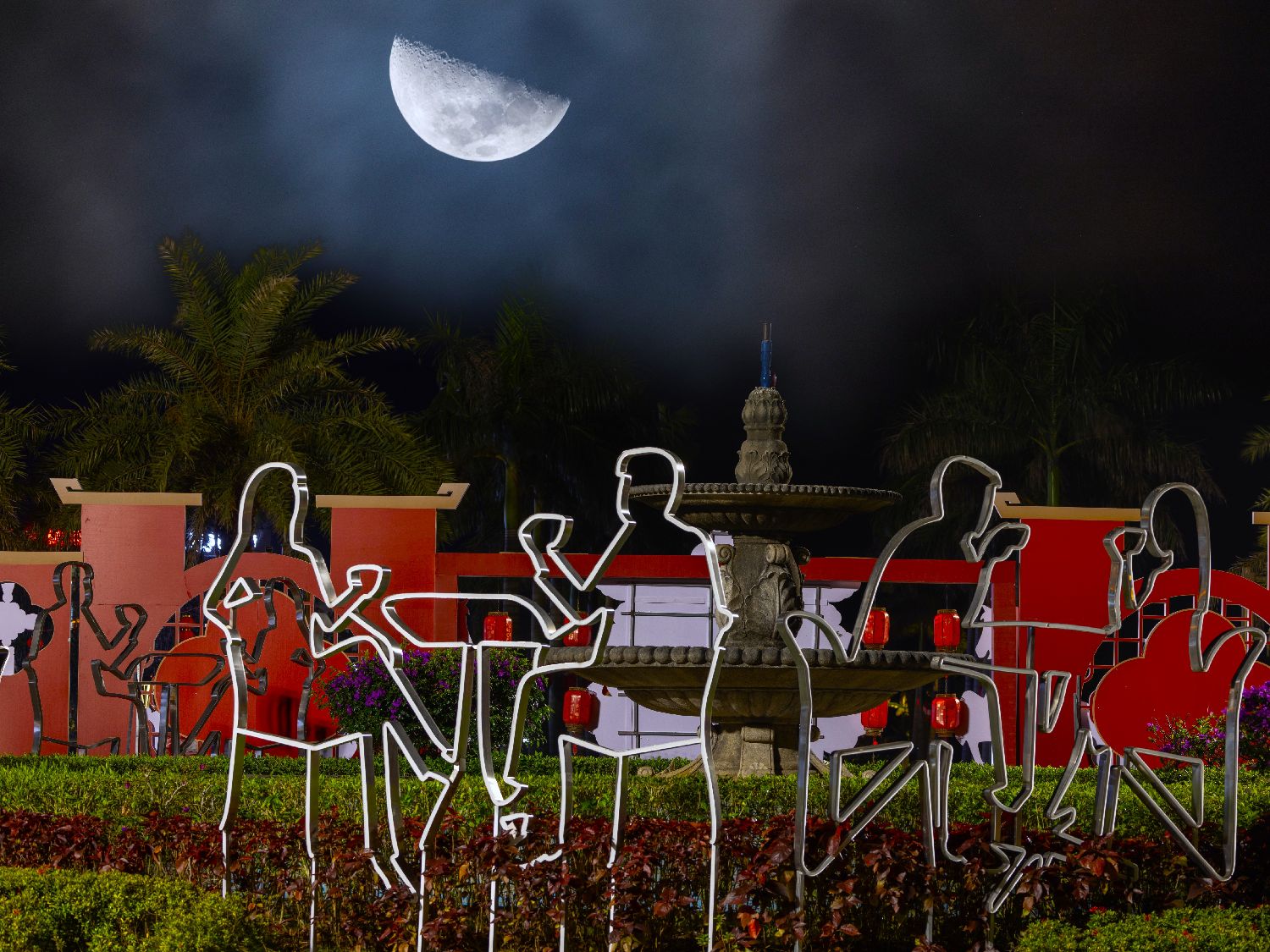 图为2月24日的海南澄迈,福山咖啡文化风情镇景区中心区弦月与咖啡题材雕塑相映成趣(二次曝光)。(CFP)