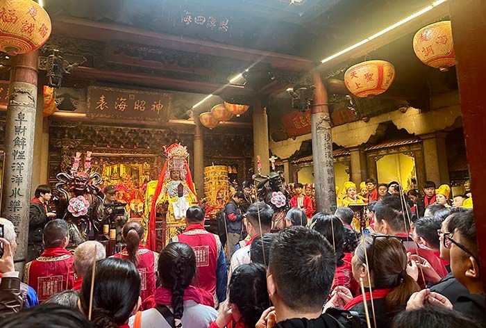 当地时间当日9时58分,湄洲妈祖祖庙内锣鼓铿锵、人潮如织,气氛庄重而热烈。两岸妈祖信众共同参与妈祖金身起驾仪式,行三献礼,恭请妈祖金身起驾出巡。
