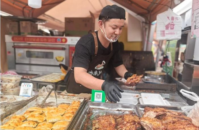 图为来自新疆伊犁的鲜先生在“吃在沙甸”美食街为顾客打包烤羊排。(图/中新网)