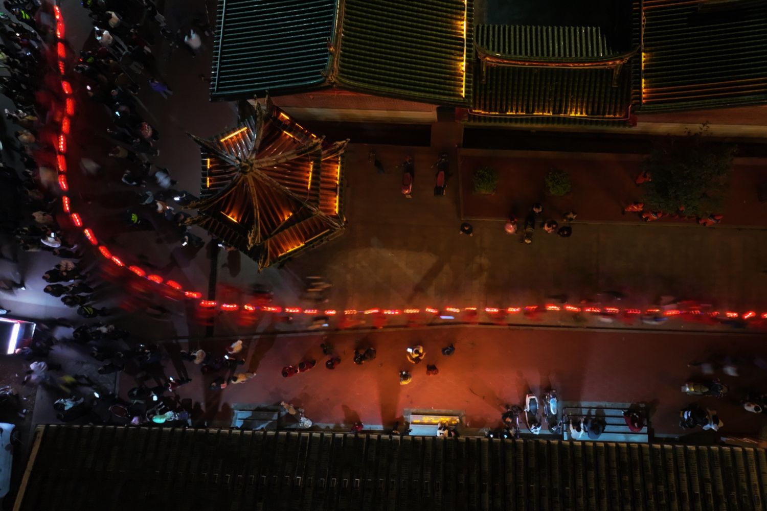 “起驾!”随着夜幕降临,领队一声号令,锣鼓唢呐齐鸣,灯阵如一条火龙缓缓启动。队伍中,火鼎公婆、拍胸舞、车鼓舞、电音三太子等表演轮番上阵,巡游路线从英都昭惠庙出发,每到一处,沿街村民燃放烟花爆竹迎灯,村民、游客举着手机记录,整个镇区都笼罩在热气腾腾的年味里。
