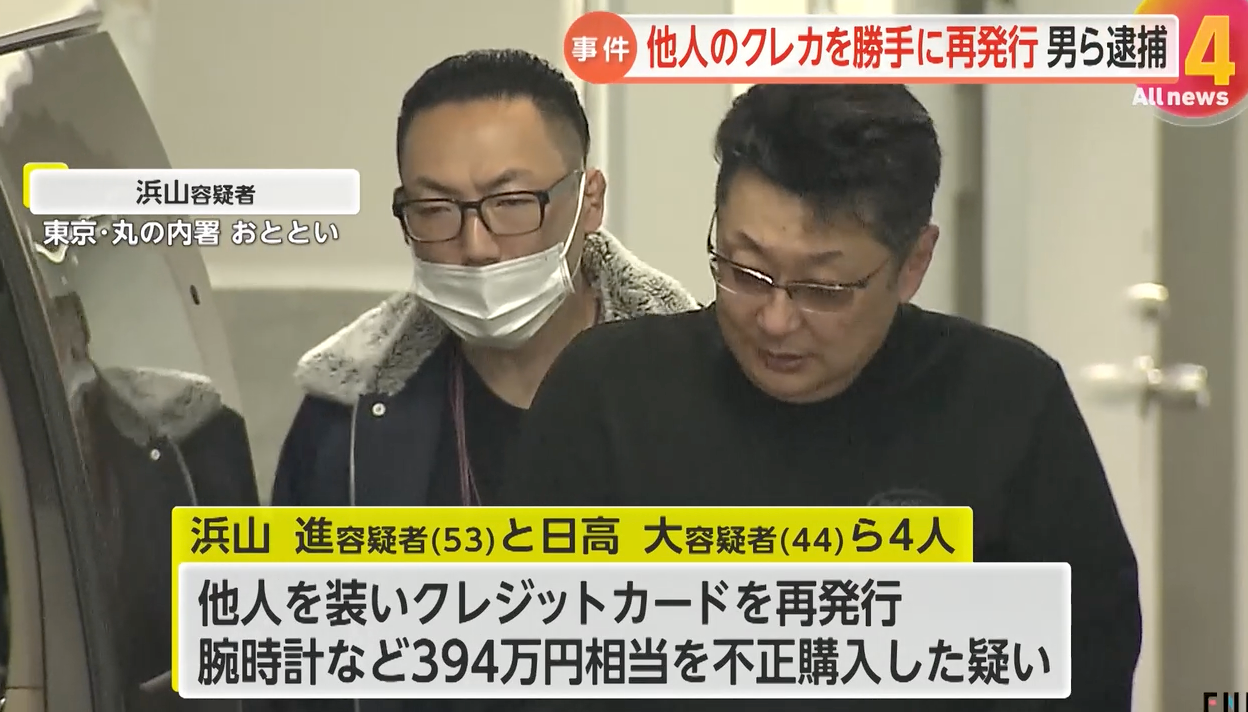 据警方通报,犯罪嫌疑人滨山进(53岁)、日高大(44岁)等4人涉嫌于2025年11月通过冒充他人身份的方式,非法重新办理了受害者的信用卡。随后,该团伙使用这张补办的卡片疯狂消费,购买了包括名贵腕表在内总价值约21.4万人民币(394万日元)的财物。