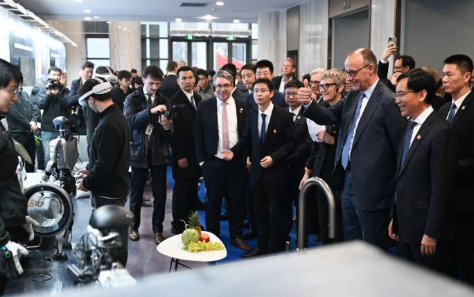 2月26日,德国总理默茨为中国人形机器人点赞。(图/中新社)