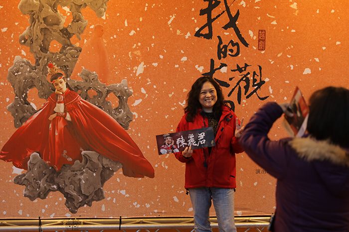 当地时间2月25日晚,浙江小百花越剧团演出前,观众在台湾桃园展演中心《我的大观园》巨幅海报前留影。 (图/中新社)