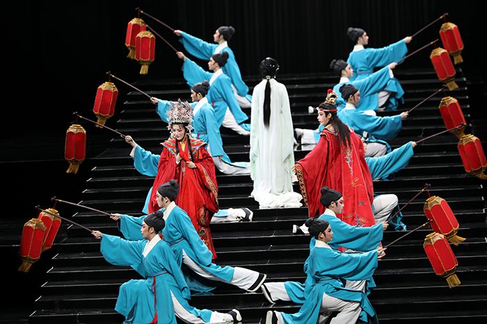 当地时间2月25日晚,浙江小百花越剧团《我的大观园》在桃园展演中心上演,图为剧中贾宝玉与金陵十二钗同框场景。 (图/中新社)
