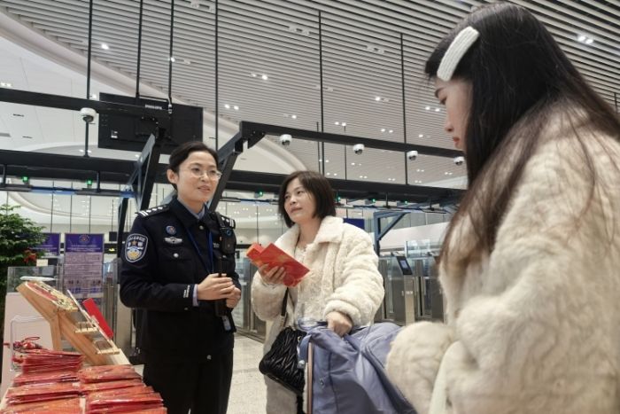 今年2月16日,在福建厦门五通客运码头,高崎边检站执勤民警向两岸旅客送上新春礼品及祝福。(图/中新社)