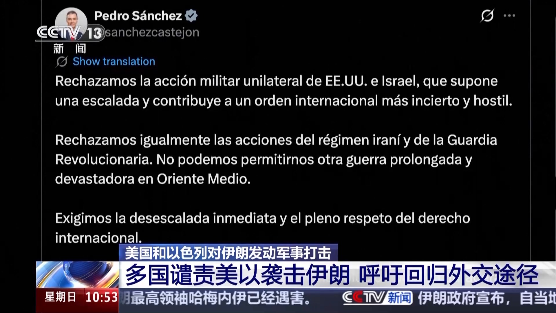 西班牙首相桑切斯在社交媒体上说,西班牙反对美国和以色列采取的单边军事行动,认为这将导致局势升级,并使国际秩序更加不确定。