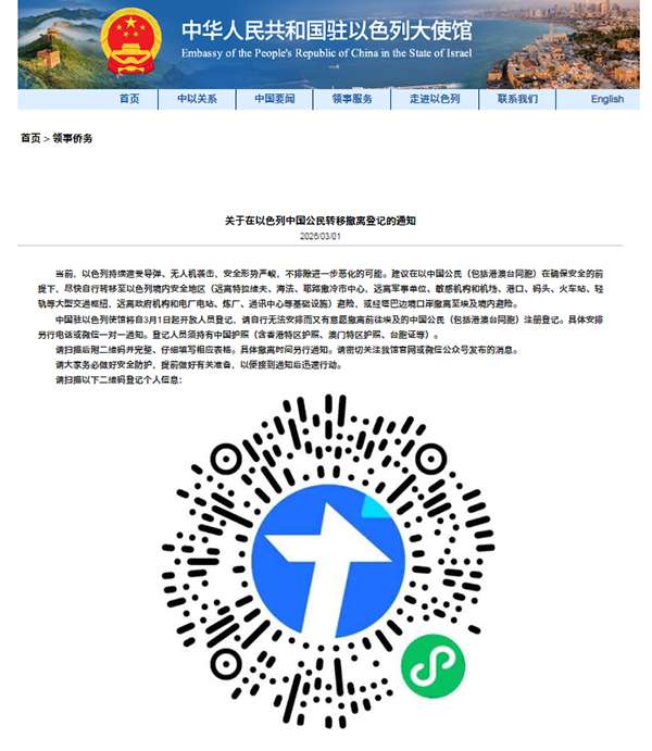 中国驻以色列使馆3月1日发布通知称,建议在以的中国公民(包括港澳台同胞)在确保安全前提下,尽快转移至以色列境内安全地区避险。使馆自3月1日起开放撤离登记,无法自行安排但有意前往埃及的中国公民(含港澳台同胞)可注册登记,需持有效中国护照或港澳台相关证件(台胞证、港澳特区护照等)。