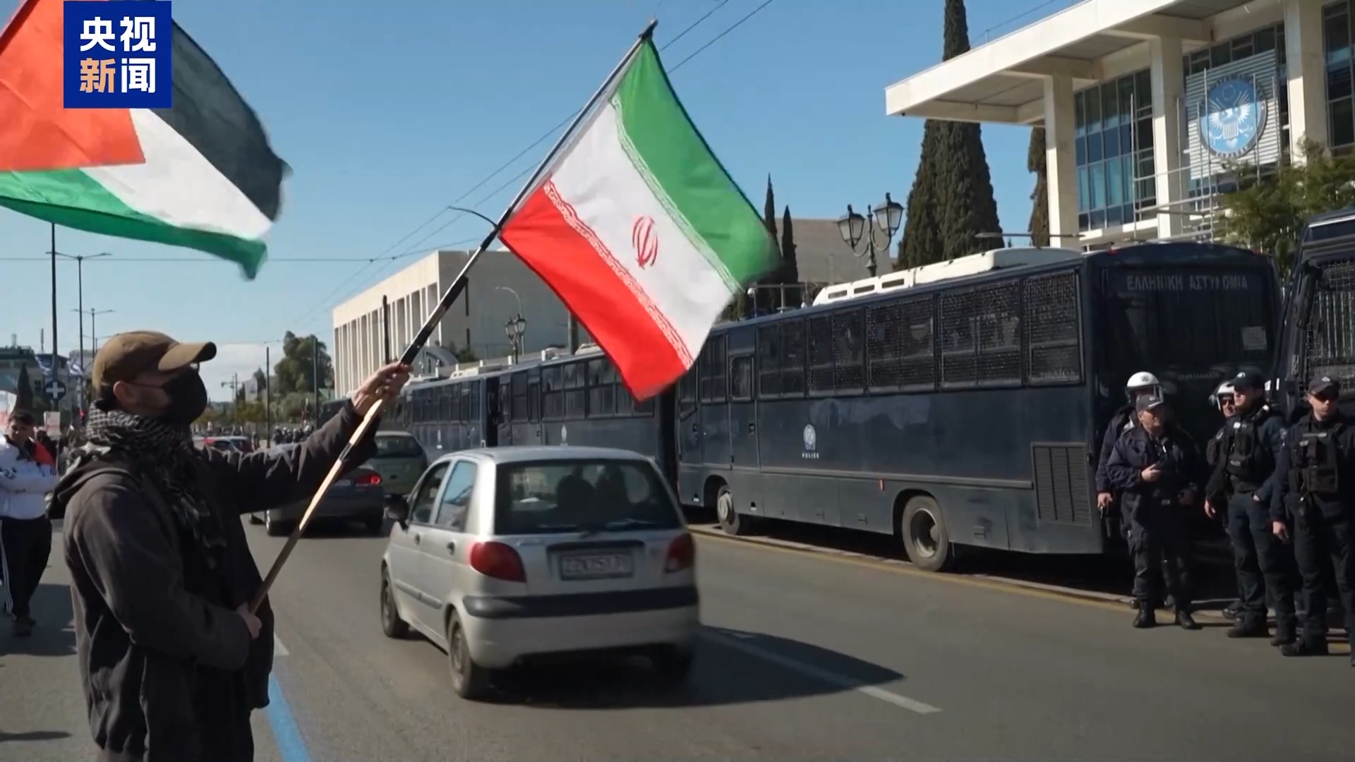 在希腊雅典的美国和以色列大使馆前,逾千名示威者手持伊朗国旗或标语牌、高喊口号参与游行示威活动,抗议美以对伊朗发动袭击。为维护现场秩序,当地出动大量警力并在美国和以色列大使馆前使用一排警用大巴封锁隔离。