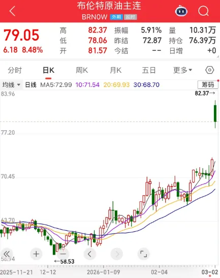 3月2日,国际油价开盘时飙升8美元,因美伊冲突加剧,导致石油运输受阻。布伦特原油开盘飙升13%,达到82.37美元/桶的高位,WTI原油跃升至80.82美元/桶。