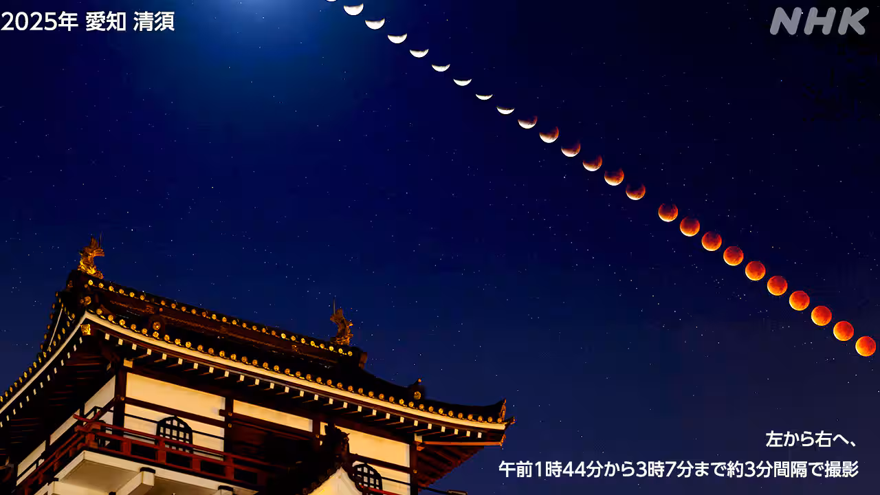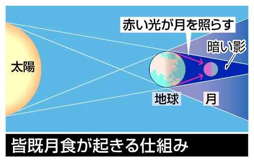 月全食是指太阳、地球和月球排列成一直线,满月完全进入地球阴影之中的现象。发生月全食时,月球会受到经地球大气层折射的太阳红色光线照射,呈现被称为“赤铜色”的红黑色光辉。据国立天文台介绍,3日夜间的观测时间为:下午6点50分左右,位于东方天空的月亮开始出现缺角;下午8点04分至9点03分,约1小时期间,在东南偏东方向可观测到月全食的全过程。之后月亮将逐渐恢复部分月食状态,并在晚上10点18分左右恢复为原本的满月。这是自2025年9月8日以来,时隔约半年,日本全国再次可以观测到月全食。