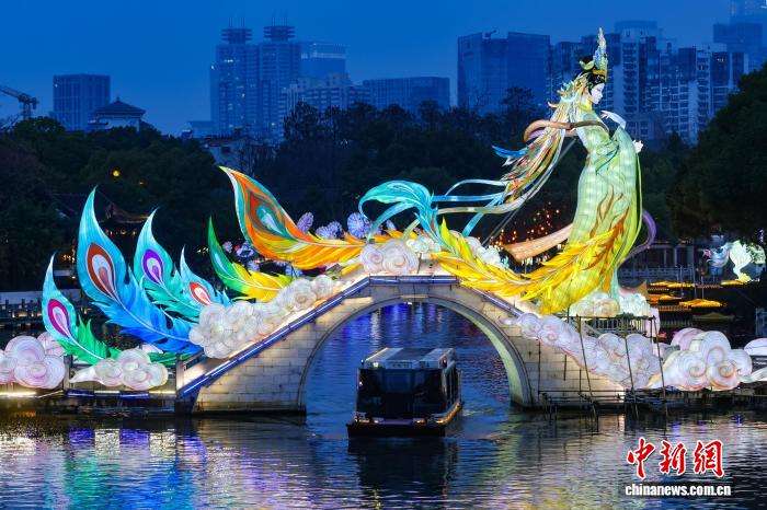 2月27日晚,江苏南京,游船从展出的大型彩灯下驶过。 中新社记者泱波摄