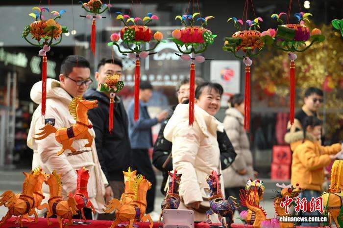 2月17日,农历正月初一,南京传统手扎花灯荷花灯、马灯、莲花灯、兔子灯、菠萝灯等集中亮相,造型各异,色彩缤纷,吸引民众前来赏灯买灯过大年。 中新社记者泱波摄