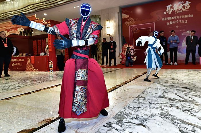2月11日,中国国台办在福州看望慰问台商台胞,举办台商台胞迎新春座谈会和“谋发展促融合——两岸同胞共贺丙午新春”联谊活动。图为机器人表演舞蹈欢迎参加联谊活动的嘉宾。(图/中新社)