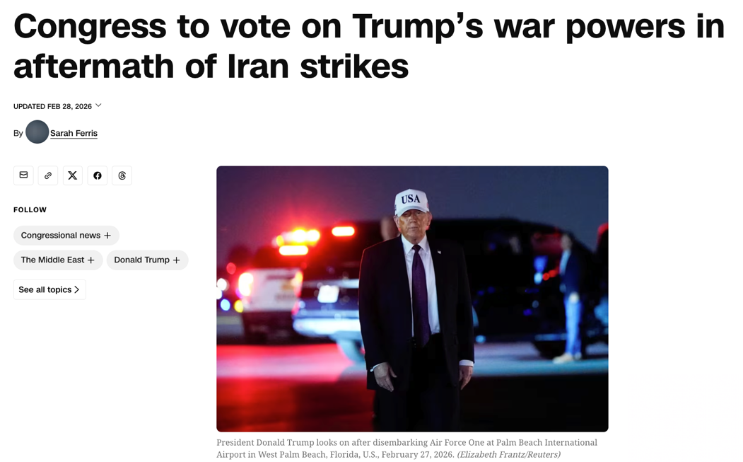 △美国国家公共广播电台报道,本周,国会将对旨在限制特朗普在伊朗军事行动的战争权力决议进行投票。
