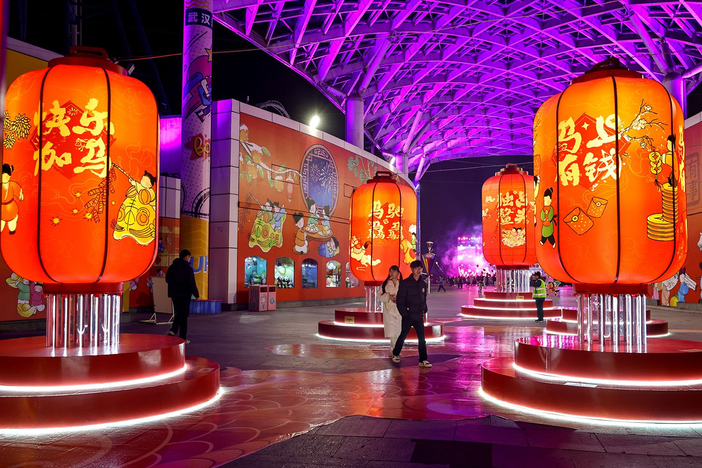 3月2日,武汉欢乐谷张灯结彩迎元宵。市民与游客在园区里赏花灯、品民俗、尝美食,观看“飞天鳌鱼”、打铁花、花车巡游等活动,迎接元宵佳节的到来。图为游客赏花灯。(中新社)