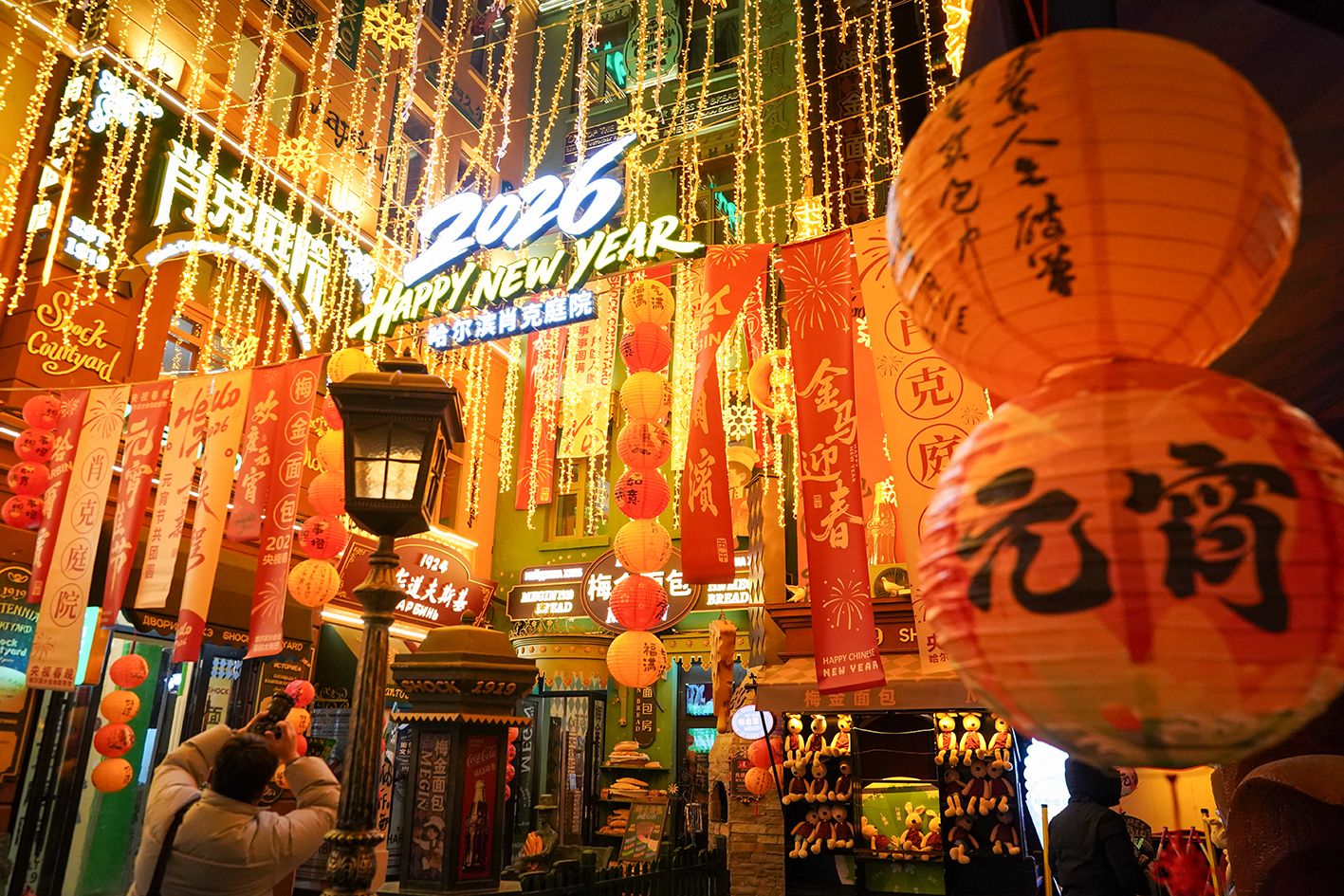 3月2日,黑龙江哈尔滨,元宵节灯饰吸引游客打卡。随着元宵节临近,哈尔滨中央大街、防洪纪念塔附近打造元宵灯饰,让市民游客感受浓厚的节日氛围。(中新社)