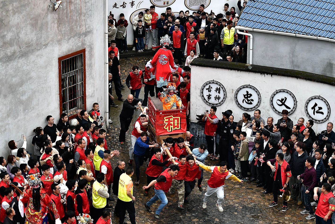 3月2日,素有“山村狂欢节”美称的走古事,在“客家祖地”福建省龙岩市连城县罗坊乡激情上演。孩童装扮成古时人物,站在木栏上,由人们抬着在陆地上竞跑。罗坊乡的“走古事”是当地客家人为纪念祖先不远万里由中原迁徙而来举办的闹元宵活动。图为村民们抬着“古事”在村庄里狂奔。(中新社)