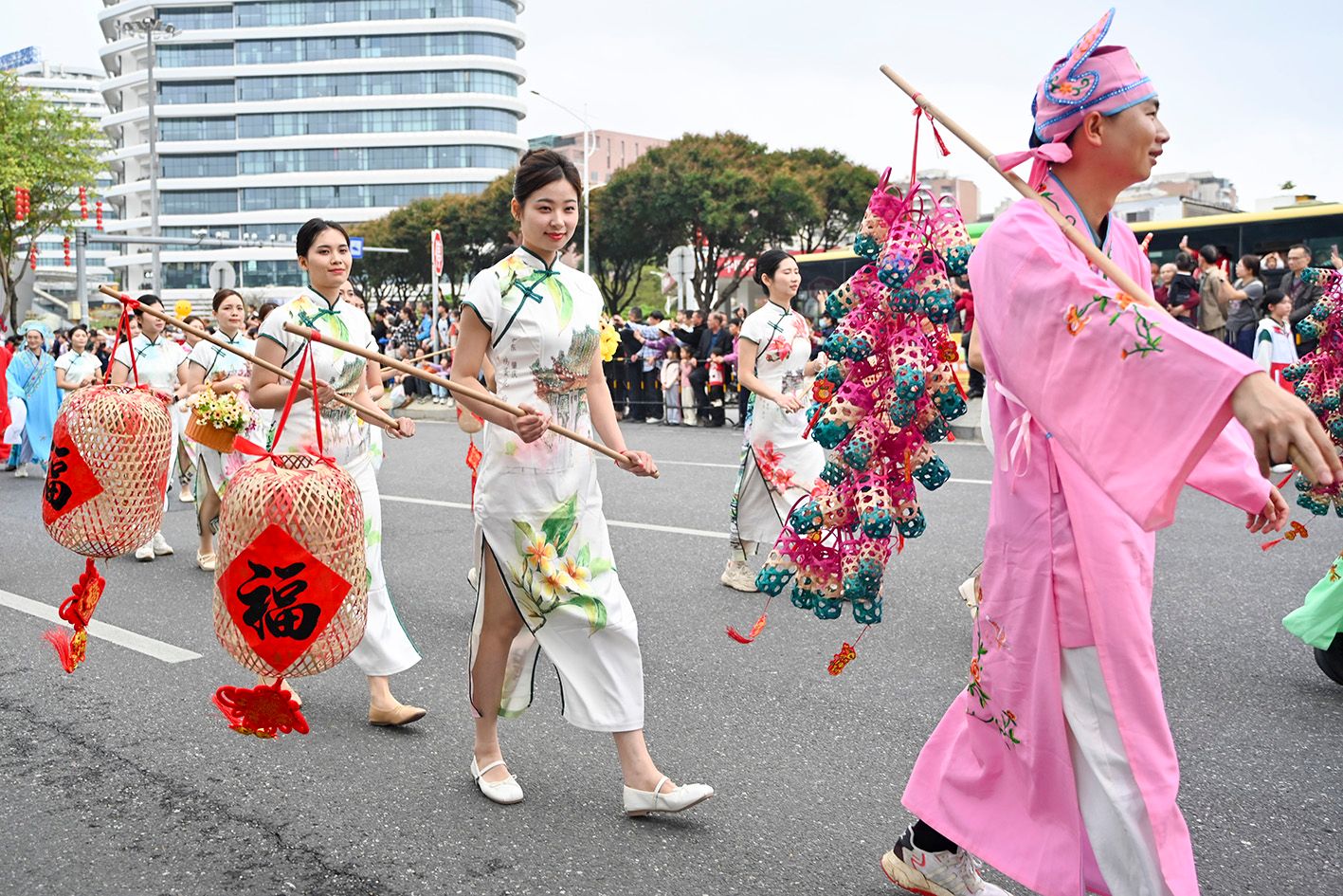 3月1日,“广府风韵汇星湖 多彩非遗闹元宵”2026肇庆广府文化庙会非遗巡游活动在广东肇庆七星岩东门广场举行,传统舞蹈、民俗技艺等主题的25个方阵队伍先后登场,向市民和游客奉上一场充满广府味道、满载传统年味的特色文化盛宴。图为活动上的“新桥洋篮庆丰年”方阵。(中新社)
