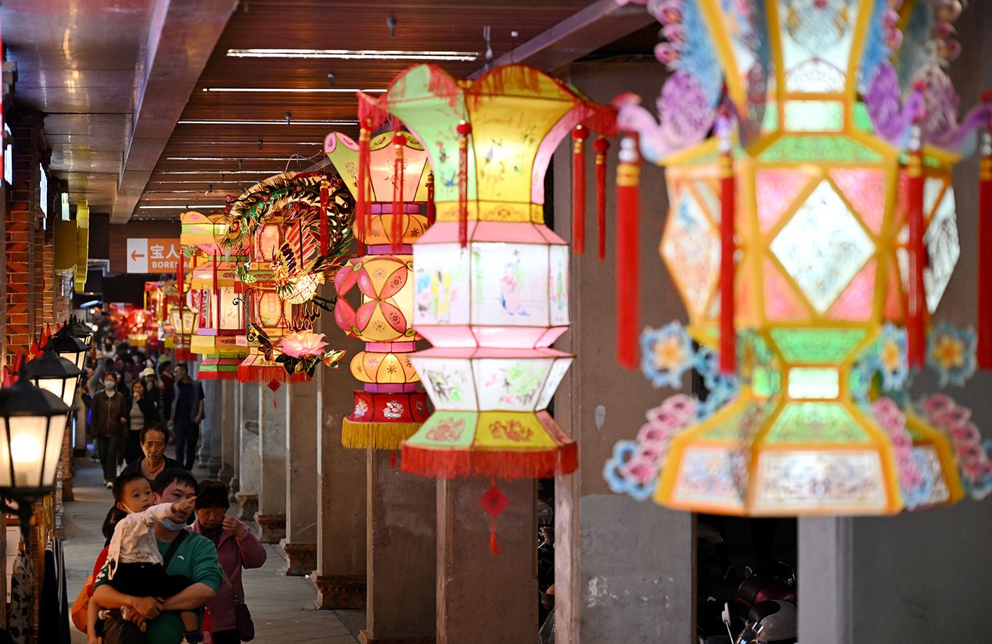 当地时间3月2日晚,市民和游客在福建泉州古城区游览、赏灯。元宵将至,彩扎灯、针刺灯、刻纸灯、料丝灯等逾2000盏花灯将泉州古城装点得流光溢彩、美不胜收。(中新社)