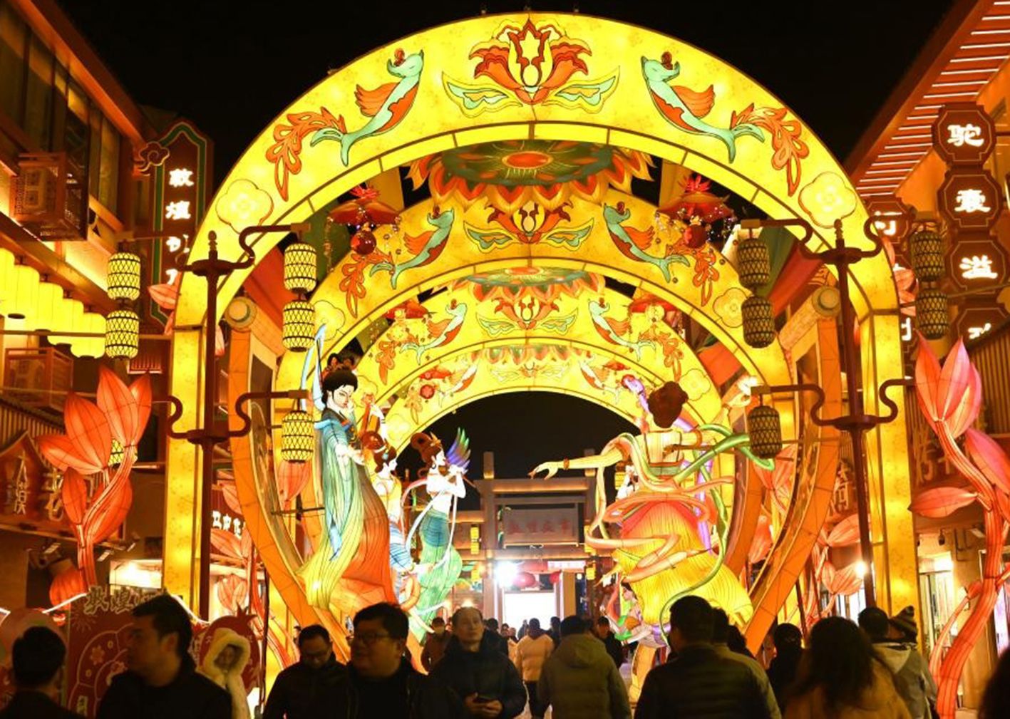 3月1日,人们在甘肃省敦煌夜市举办的敦煌灯会上观赏花灯。(新华社)