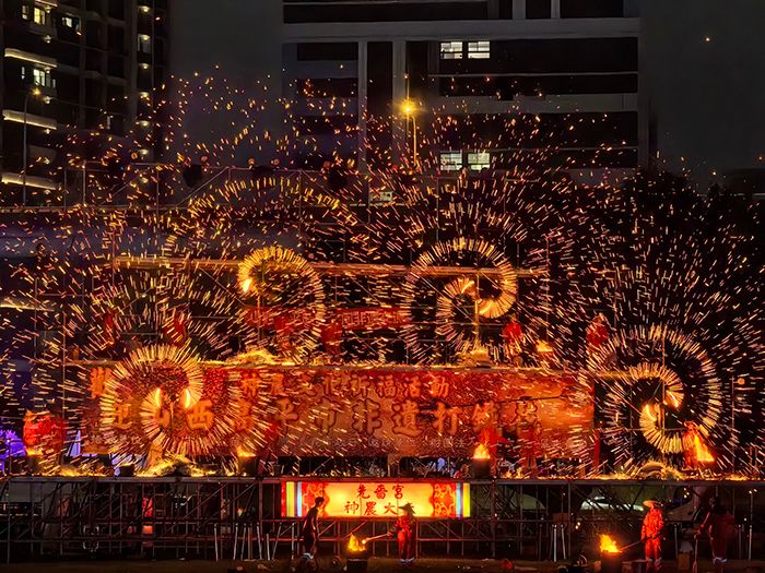 2月22日至24日,打铁花表演团队在新北灯会率先登场。表演者将1600℃的高温铁水奋力击向天际,瞬间炸裂成万千金红色的“铁花雨”。“铁花雨”与花灯交相辉映,场面壮观。附近草坪上、天桥上挤满前来观看的民众,每次铁花飞溅,都引来阵阵惊呼。
