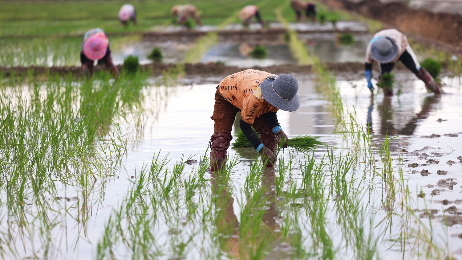 图为3月4日,海南三亚,农民在三亚市天涯区水蛟村田间插秧。(CFP)