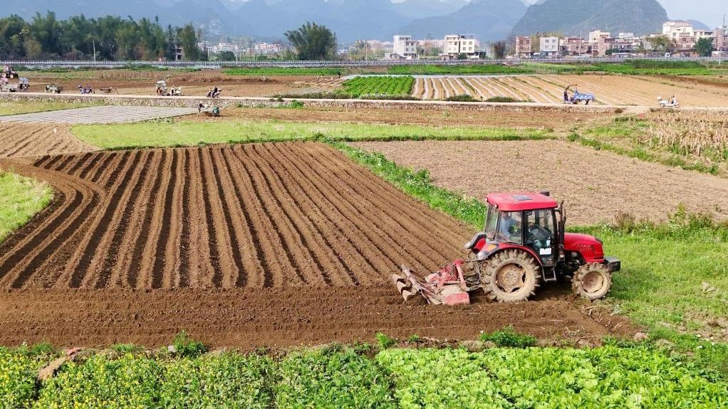 图为近日,广西来宾,忻城县城关镇都乐村农民驾驶农机在翻耕田地,准备种植玉米(无人机照片)。(新华社)