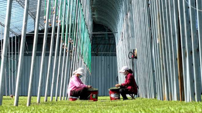 图为3月2日,新疆维吾尔自治区,新疆生产建设兵团第二师二十二团十连的职工民众在温室大棚内管护辣椒秧苗。(乌鲁木齐天山网)