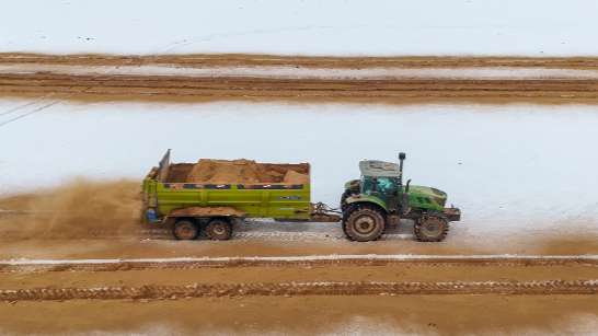 图为3月1日,新疆维吾尔自治区,在呼图壁县种牛场农田,农民正驾驶撒肥车向田间抛撒肥料,为春耕生产奠定良好基础。(乌鲁木齐天山网)