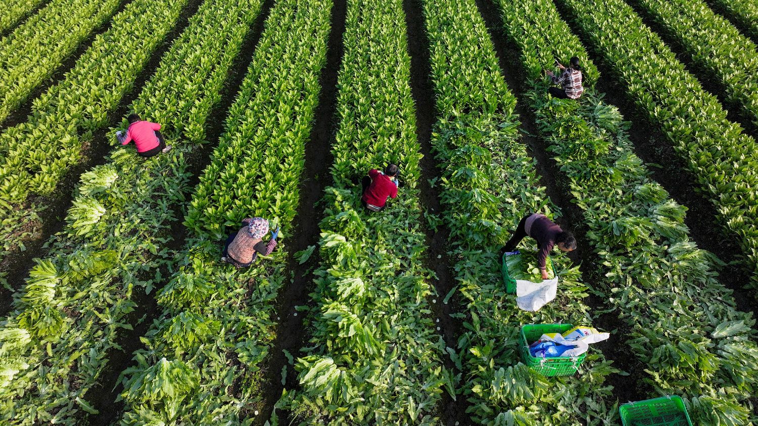 图为3月4日,四川成都,彭州市濛阳街道白土河村农民在采收蔬菜。(中新社)