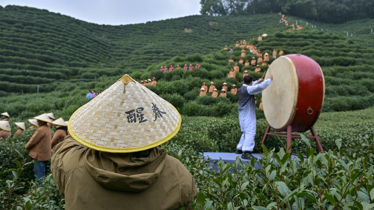 图为3月5日,浙江杭州,二十四节气中的惊蛰,西湖龙井核心产区满觉陇马儿山举行“喊山祈福”活动,茶农呼唤“茶发芽大丰收”,为西湖龙井新芽祈愿丰收。(CFP)