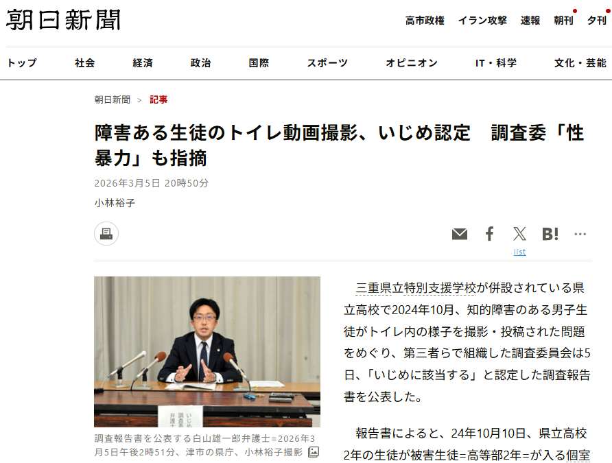 与三重县立特别支援学校并设的三重县立高中在2024年10月发生了一起欺凌事件,一名有智力障碍的男学生在厕所内如厕的画面被拍摄并上传到网络。对此,由第三方组成的调查委员会于5日公布了调查报告,认定该事件“构成欺凌”。