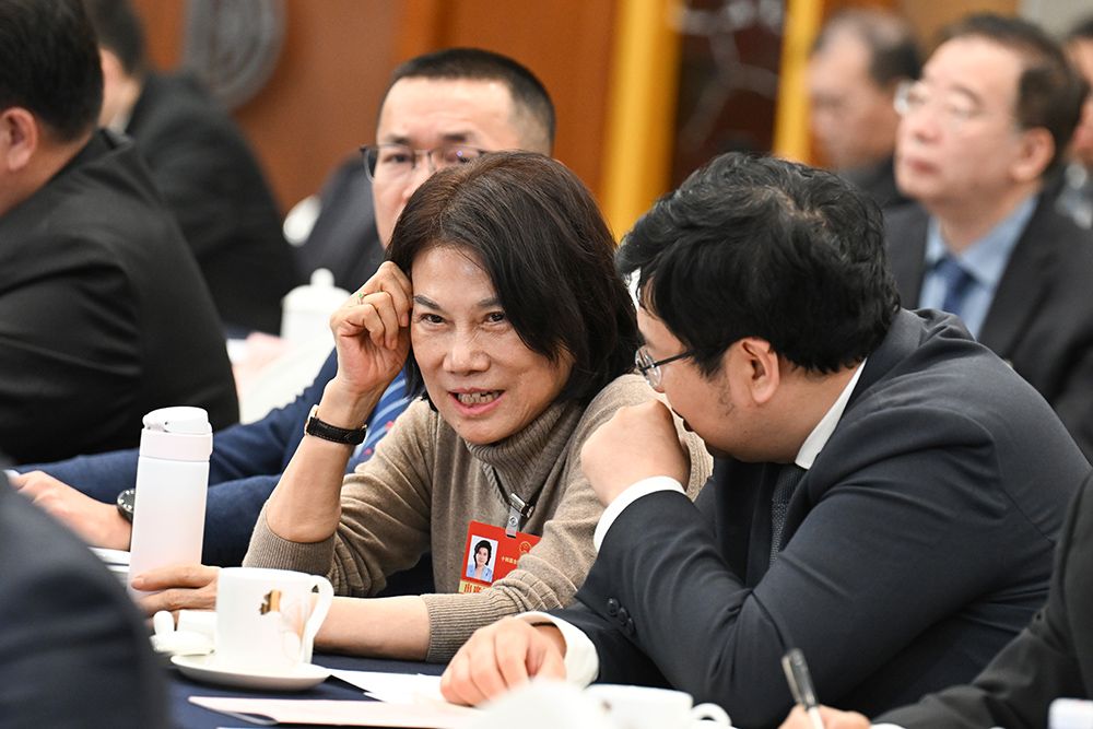 6日,十四届全国人大四次会议广东代表团举行开放团组会议。图为全国人大代表、珠海格力电器股份有限公司董事长董明珠(左)与代表交流。(图/中新社)
