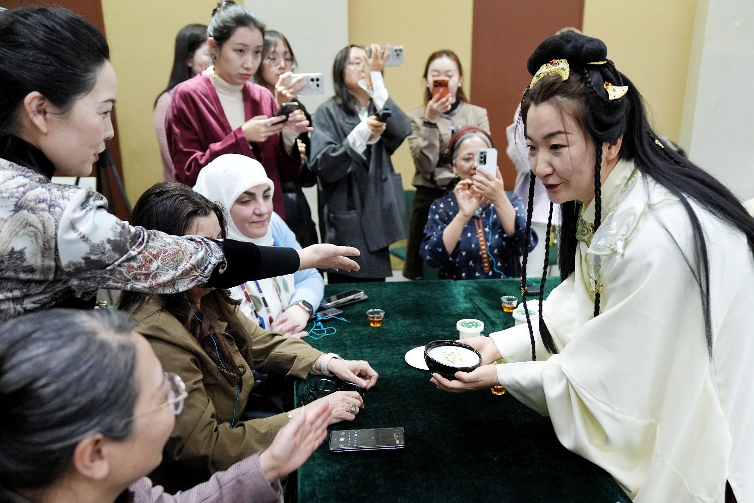 在“三八”国际劳动妇女节即将来临之际,中国各地开展形式多样的庆祝活动,以多元形式致敬女性,为广大妇女送上节日的美好祝福。图为3月5日,宋氏点茶表演吸引嘉宾。来自比利时、土耳其、希腊、智利、摩洛哥等24个国家的驻华大使夫人在北京参加大使夫人茶美学品鉴活动,以茶为媒,共话文化交流互鉴。(中新社)
