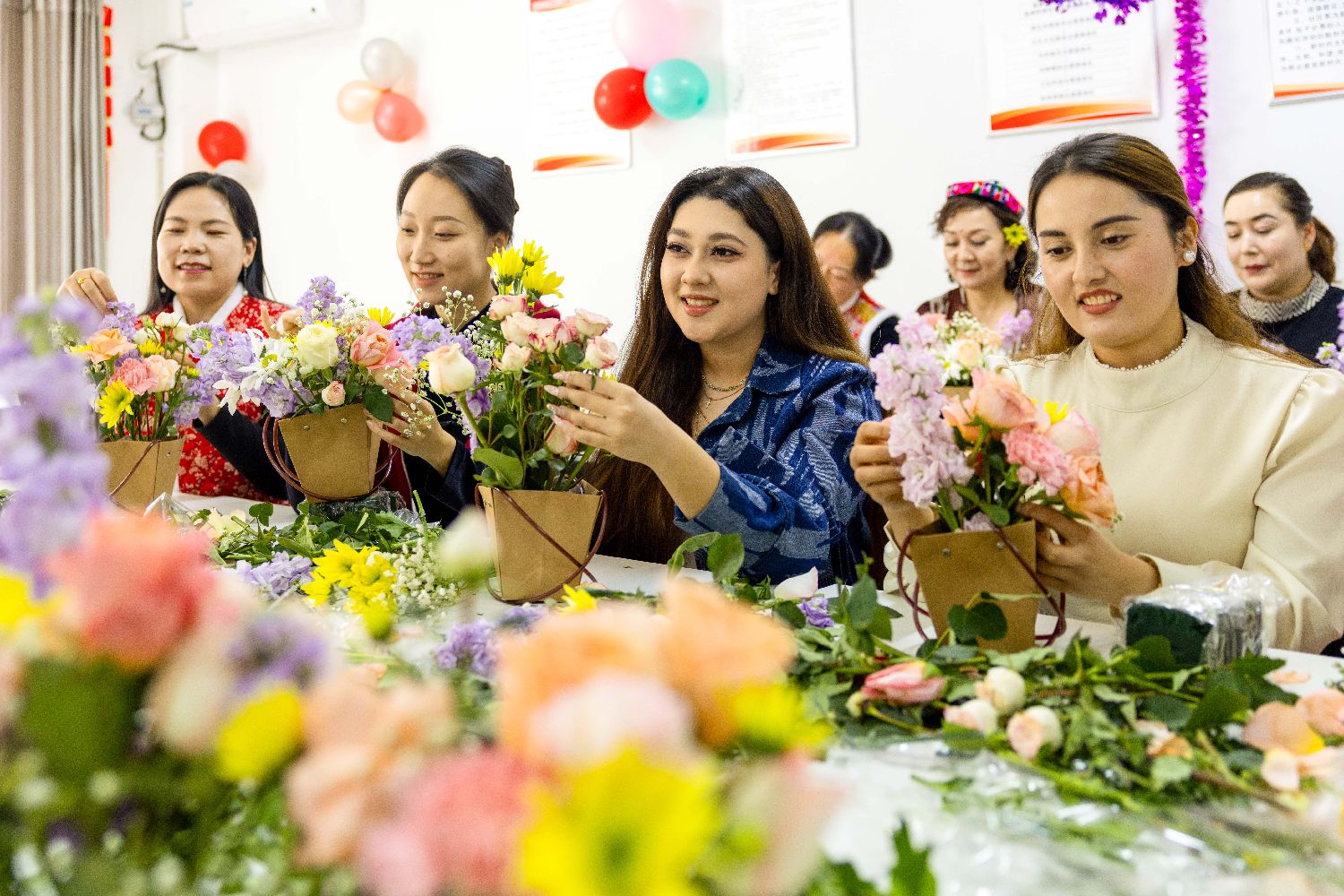 3月4日,新疆乌鲁木齐市天山区黑甲山街道富康街南社区组织辖区女同胞开展插花活动,喜迎“三八”国际劳动妇女节到来。(中新网)