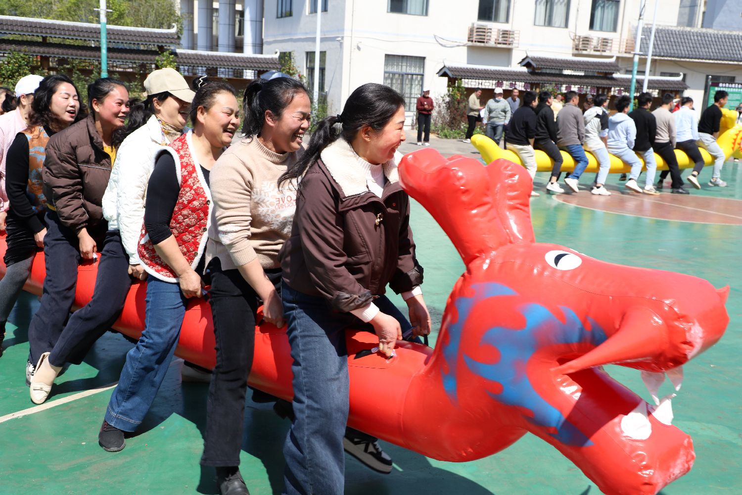 3月5日,广西柳州市融水苗族自治县四荣乡,当地妇女同胞欢聚一堂,参与背篓投绣球、同心鼓颠球、旱地龙舟竞速等趣味文体活动,共同庆祝即将到来的“三八”国际妇女节。(CFP)