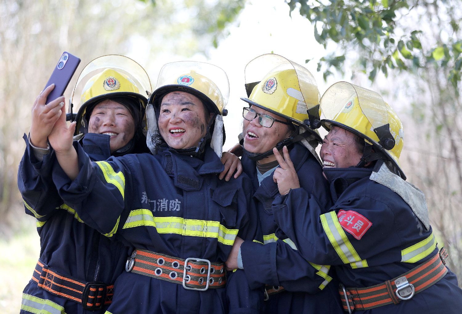 3月3日,湖北省荆门市掇刀区麻城镇丁店村,“巾帼义务消防小分队”队员们结束一场实战训练后自拍留影,她们用这份独属“火焰蓝玫瑰”的仪式感,提前解锁三八妇女节的快乐。(中新网)