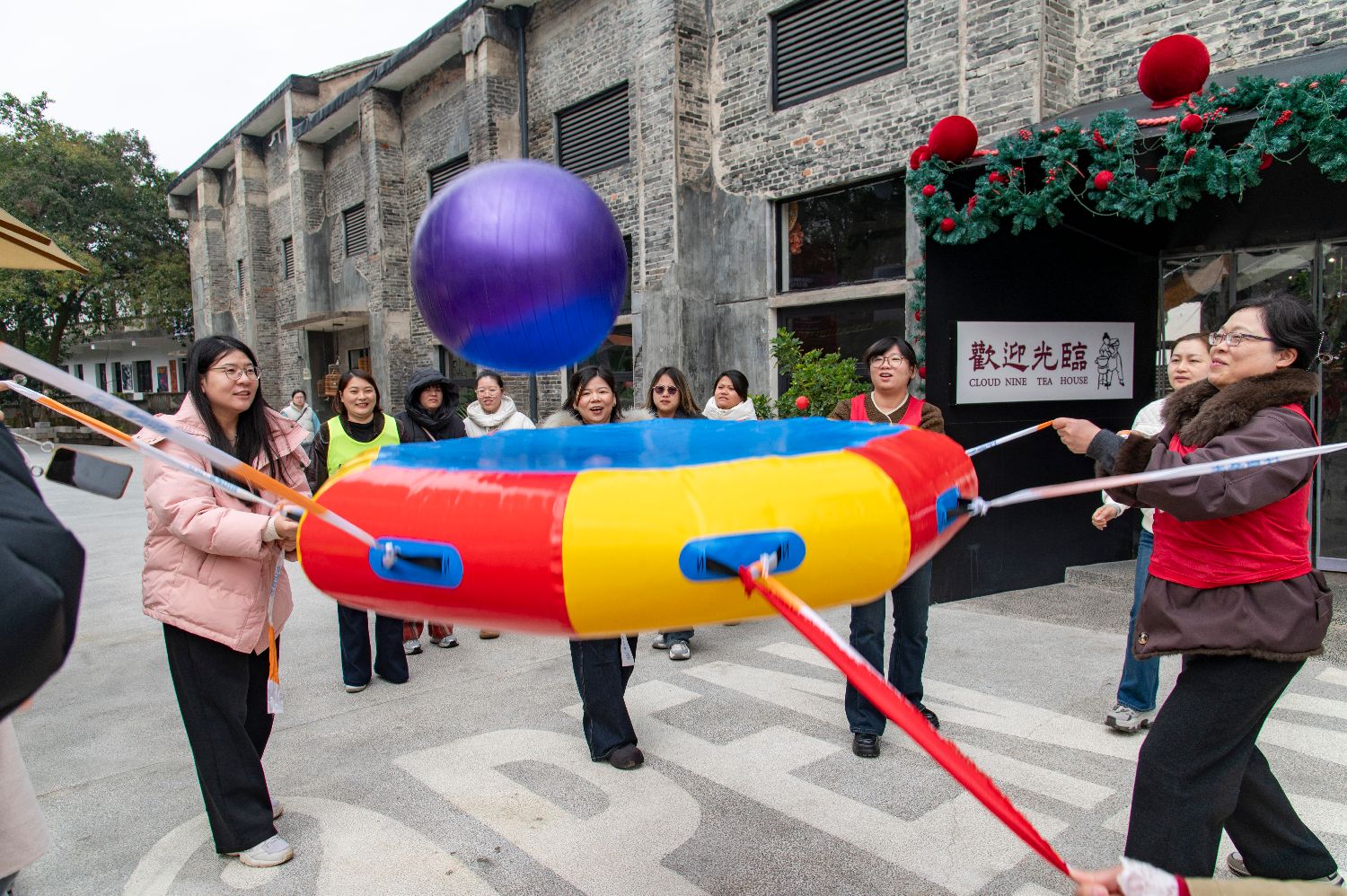 3月4日,浙江省金华市婺城区罗店镇一处野营基地里,金华通济公司女职工正开展快乐的趣味运动,喜迎“三八”妇女节到来。(中新网)