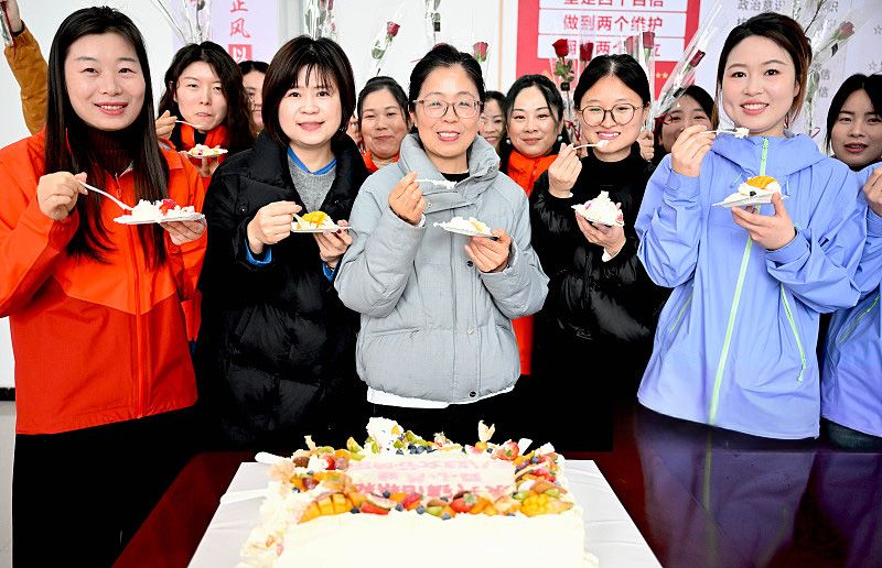 3月5日,安徽亳州,基层女干部在安徽省亳州市利辛县京盛和服装有限公司生产车间和女职工一起吃蛋糕。当日,安徽省亳州市利辛县永兴镇开展“乡镇巾帼进企业 同心筑梦迎三八”活动,组织30多名镇村女干部走进县城服装企业,参观了解企业发展的同时,并为企业女职工送来了鲜花、蛋糕,大家欢聚一堂,共话发展,迎接“三八”国际妇女节的到来。(CFP)