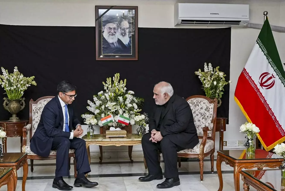 3月5日,在美以对伊朗发动袭击近一周后,印度外交秘书米斯里(左)代表政府参加伊朗驻印大使馆举办的悼念伊朗最高领袖哈梅内伊的活动。此前,印度政府对冲突保持相对沉默。(图源:《印度教徒报》)