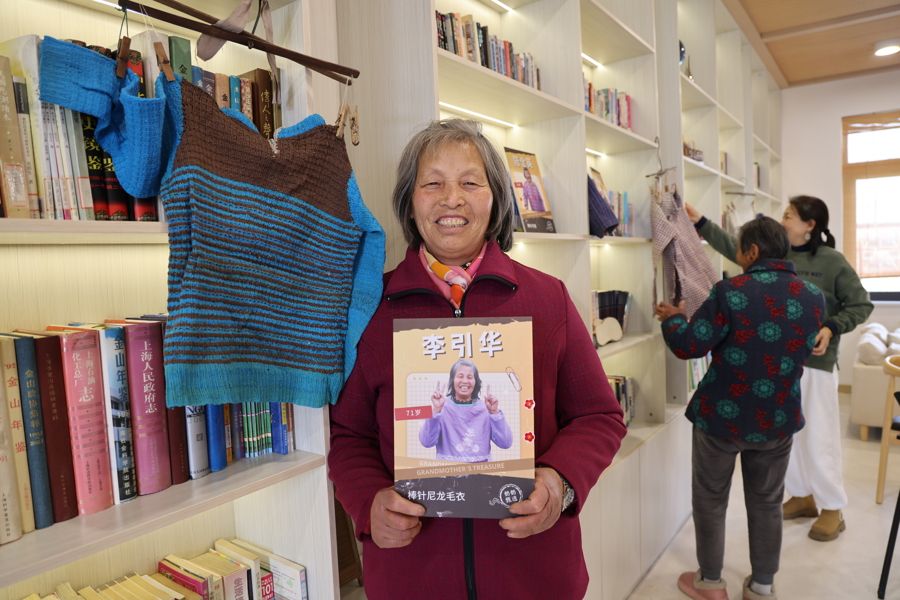 展架上,还有阿婆们缝制的土布衣裤、土布包袱,一针一线织成的棒针毛衣、棒针袜子。这些曾经只穿在自家人身上的衣物,如今成了展品,被驻足端详。