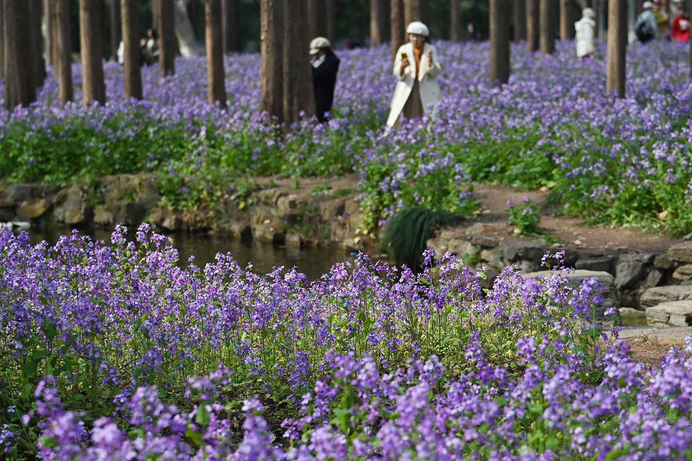 3月9日,南京理工大学校园内,二月兰盛开如紫色花海,尽展春意。(中新社)