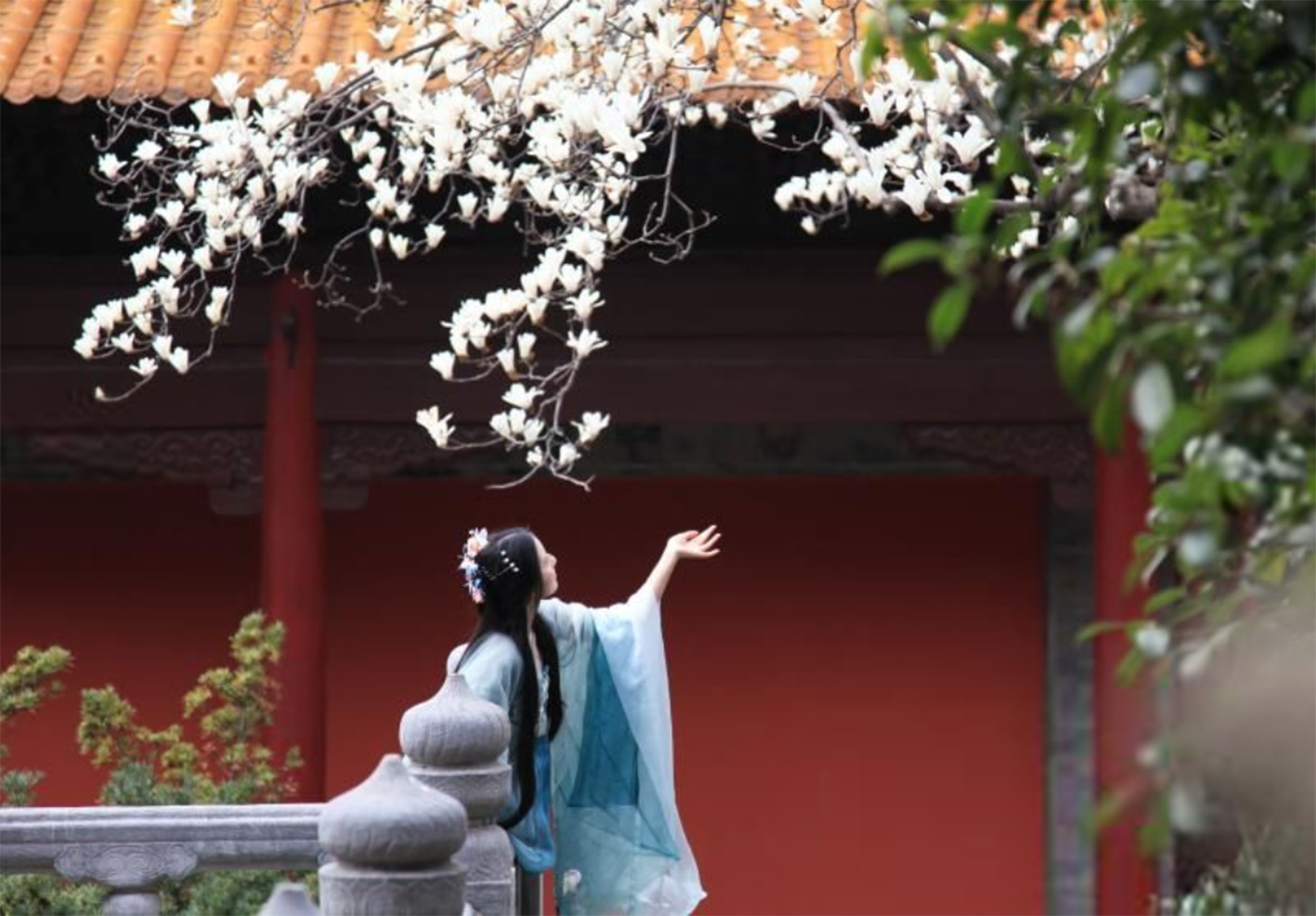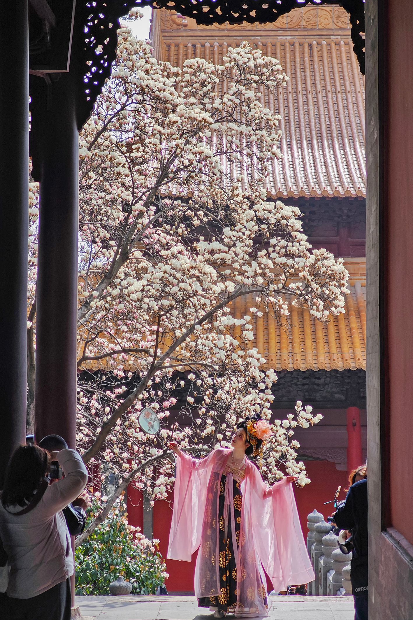 3月8日,江苏南京,身着古装的市民在朝天宫内盛开的玉兰花前拍照。(中新社)