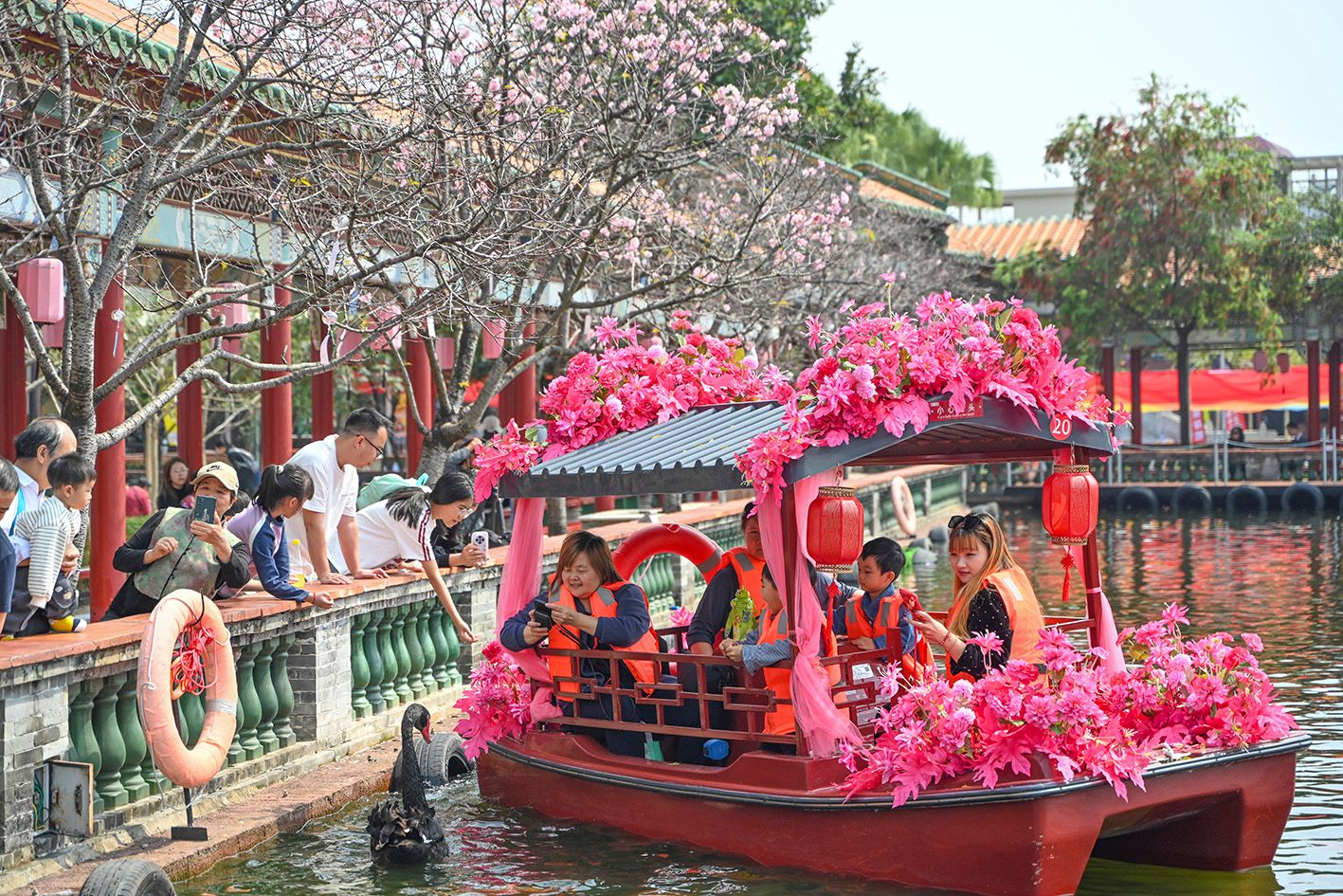 3月7日,游人在广西南宁市青秀山风景区丘石花园赏花踏春。(新华社)